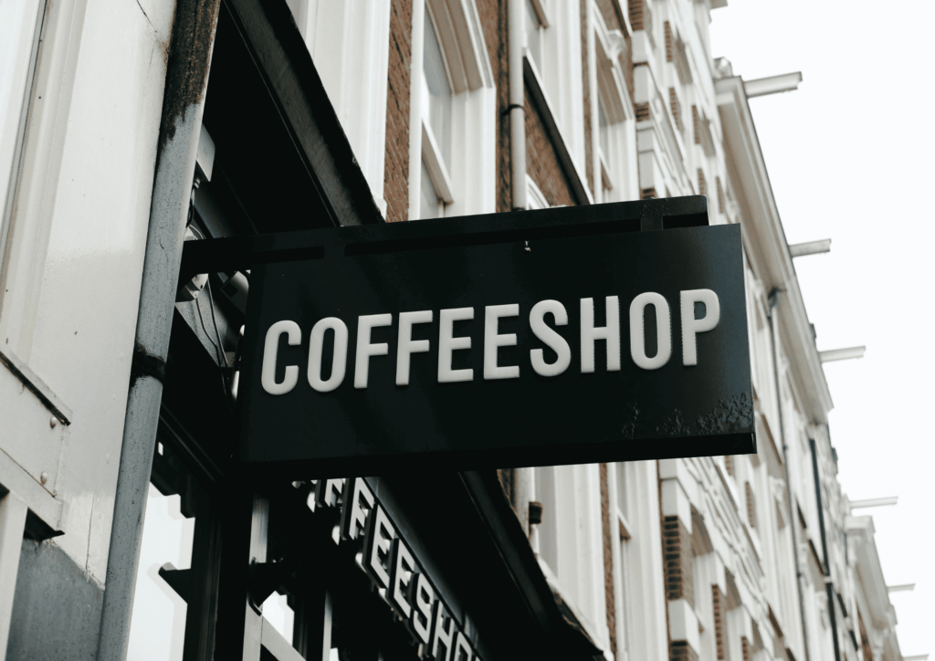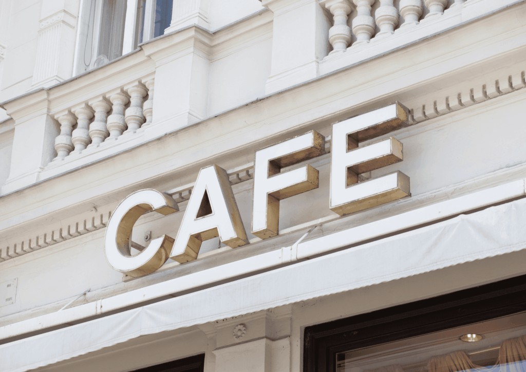 Un buen ejemplo: una cafetería que en su fachada muestra una ilustración minimalista estilizada de un café humeante, con un letrero de tipografía amigable. Aunque el diseño sea sobrio, comunica calidez, cercanía y profesionalidad.